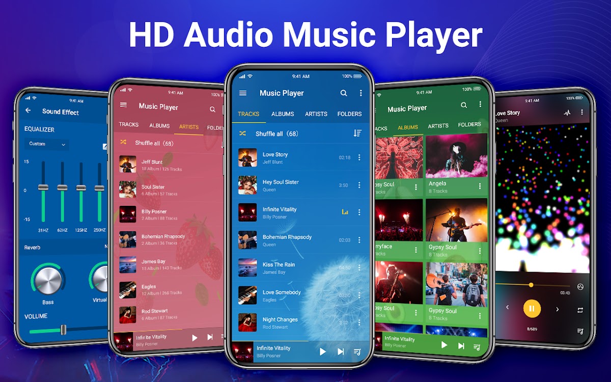 Музыкальный проигрыватель, mp3-плеер быстро находит все форматы песен. Этот mp3-плеер со встроенным эквалайзером высочайшего качества, с усилением низких частот, эффектами реверберации, эти мощные функции поднимут ваш опыт прослушивания музыки на новый уровень.