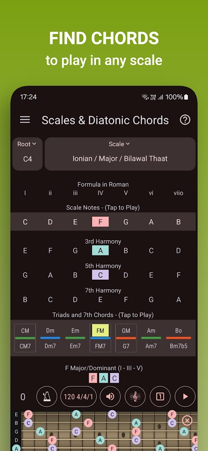✅ Гаммы и аккорды: исследуйте 86 уникальных гептатонических гамм/ладов и их диатонические трезвучия/септаккордовые образования. Приложение содержит широкий список гамм для гитары, фортепиано и вокала.