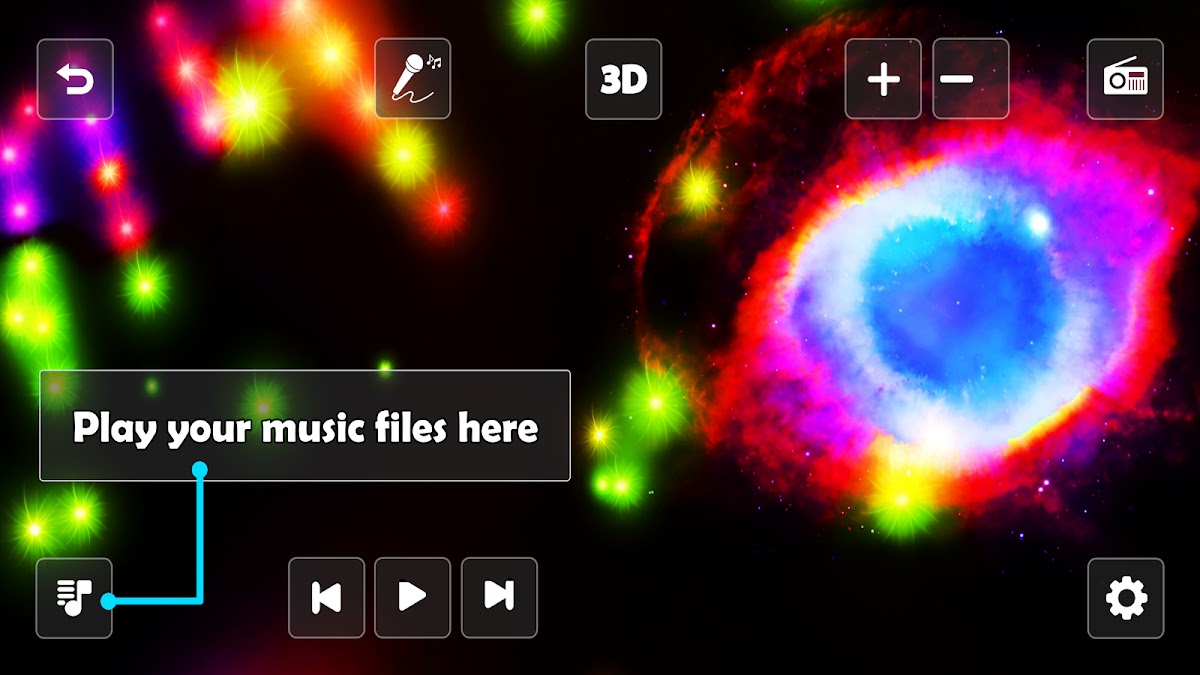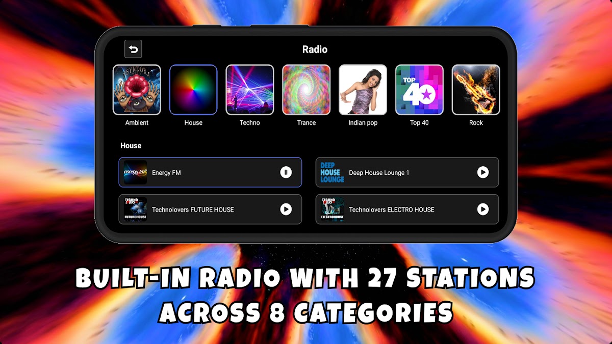 Воспроизводите музыку с помощью любого музыкального проигрывателя. Затем переключитесь на это приложение. Затем он будет визуализировать музыку. Приложение включает доступ к множеству онлайн-радиостанций разных музыкальных жанров. Также включен проигрыватель для ваших музыкальных файлов.