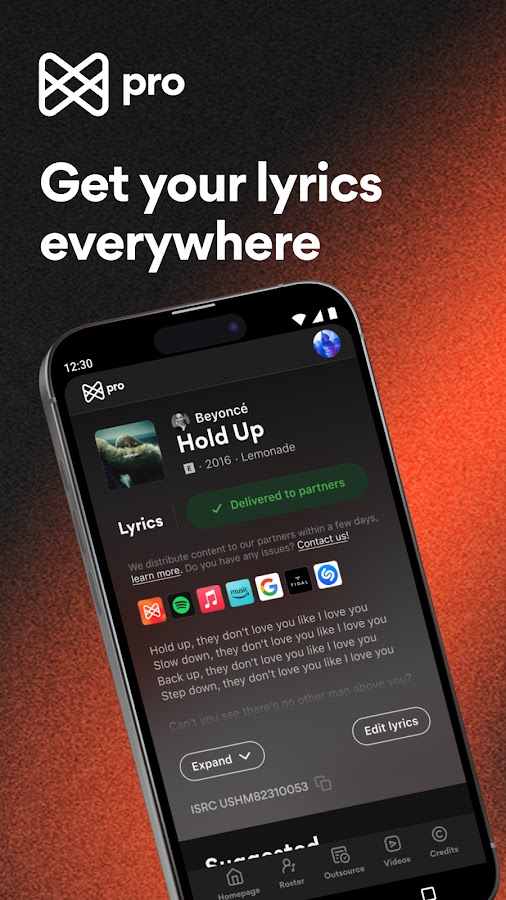 Распространяйте свои официальные тексты песен в Spotify, Apple Music, Instagram, Google и других сервисах, чтобы обогатить впечатления своих поклонников и привлечь новую аудиторию по всему миру. Подтвердите своего исполнителя и начните управлять своими текстами.