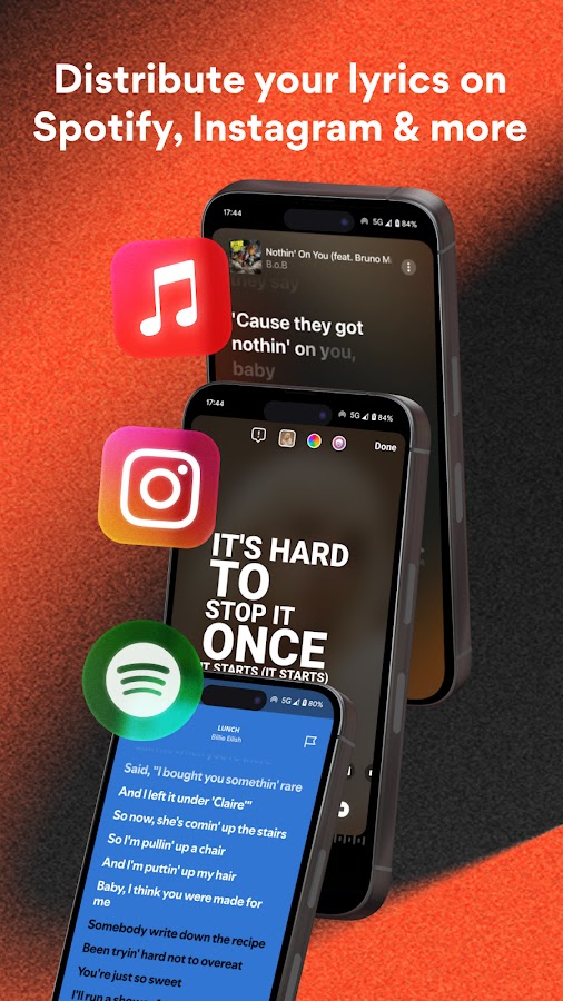 • Распространяйте свои тексты песен на потоковых сервисах, таких как Spotify и Apple Music, а также на цифровых медиа-платформах, таких как Instagram, Google, Snapchat и других.
