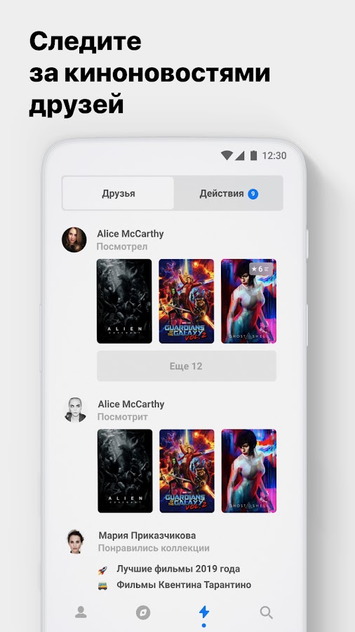 Новостная лента показывает фильмы и сериалы, которые смотрят или хотят посмотреть ваши друзья, их рейтинги, комментарии и отметки «Нравится». Задавайте им вопросы, обсуждайте впечатления, давайте рекомендации и приглашайте их в кино!