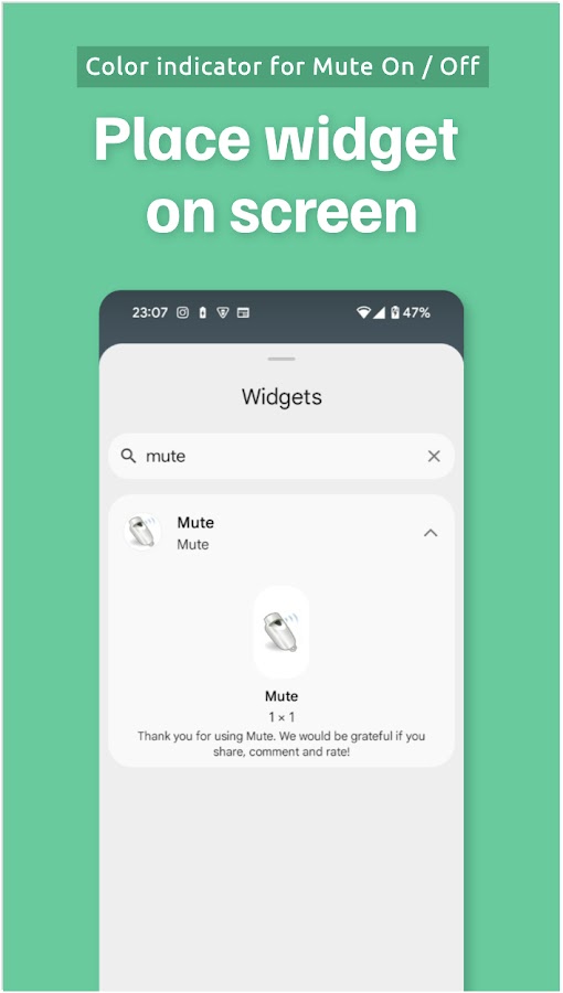 Мгновенно отключите звук на телефоне с помощью Mute! Ищете быстрый и простой способ отключить звук звонка, уведомлений и мультимедиа? Mute отключает звук в одно касание, возвращаясь к предыдущему звуковому профилю так же легко. Идеально подходит для совещаний, просмотра фильмов или любого другого времени, когда вам нужна тишина и покой. Длительное нажатие на значок позволяет установить время отключения звука.