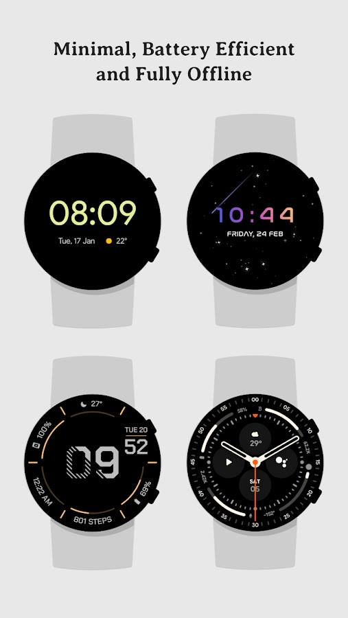 Каждый циферблат настроен на максимально низкое энергопотребление без использования фоновых процессов. Наши циферблаты полностью автономны и не используют сетевые данные для отображения. Некоторые из доступных циферблатов: