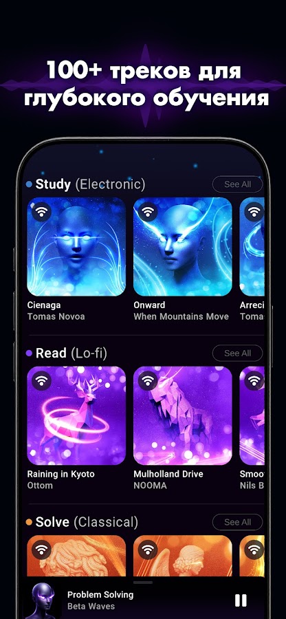 Так трудно долго удерживать сосредоточение. Внимание постоянно отвлекается в этом суетливом мире. Выберите категорию, соответствующую вашей задаче или музыкальному вкусу. Выберите «Решить» для решения задач; «Запомнить» для запоминания информации и т.д. Настройте свою музыку, добавив звуки природы и альфа-волны. Добавьте таймер, чтобы начать учебную сессию.