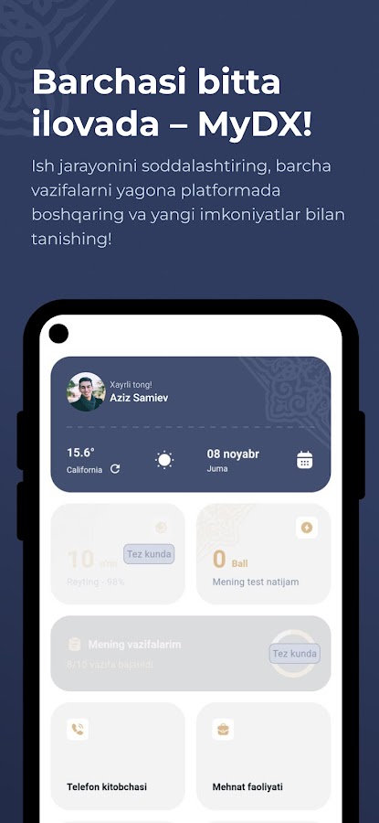 Скачайте приложение MyDX: Davlat xizmatchisi для Android бесплатно - последняя версия (1.0.18) уже доступна для установки на ваш телефон или планшет.