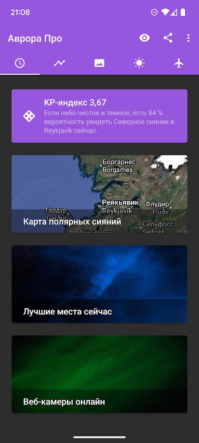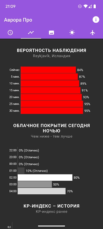 — Прогнозы на следующий час, несколько часов и несколько недель, чтобы вы могли заранее планировать наблюдение Северного сияния (в зависимости от погодных условий).