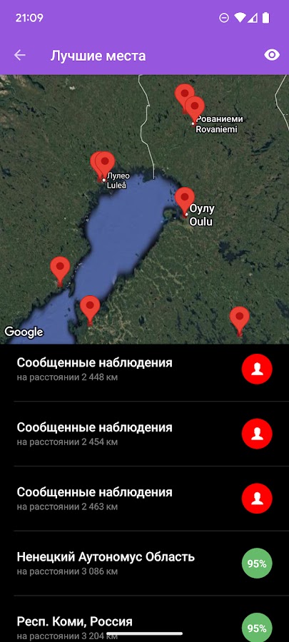 — Бесплатные уведомления при ожидаемо высокой активности полярных сияний.