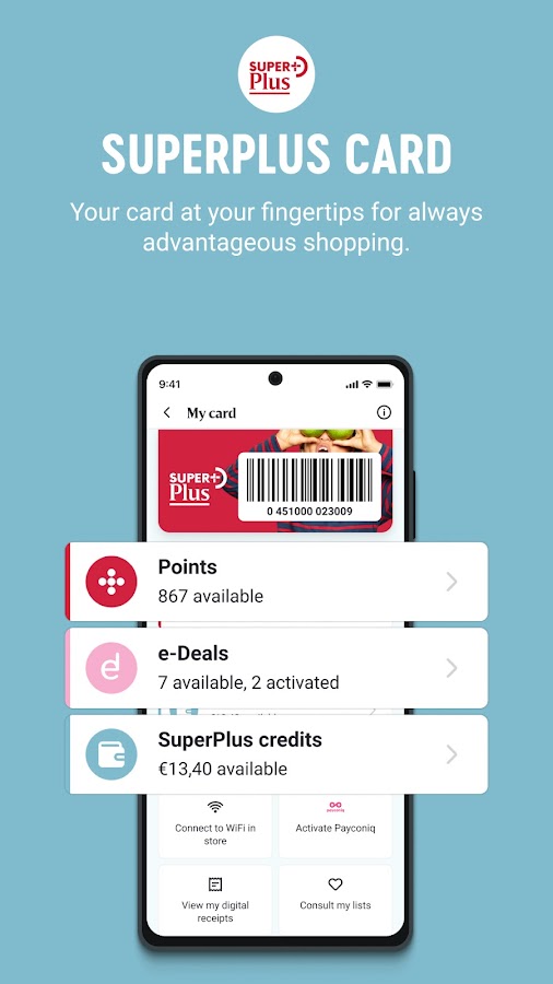 Благодаря приложению My Delhaize у вас также есть легкий доступ к вашей учетной записи Superplus: активируйте свои электронные сделки, проверьте свой кредит Superplus, обменяйте свои баллы (для сделок или с партнерами), пожертвуйте свои баллы на благотворительность в 2 клика, измените свой профиль , …