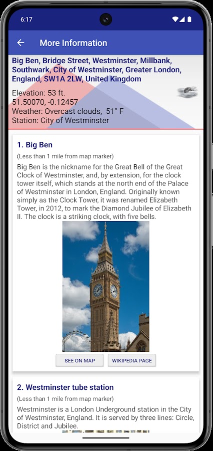 ● Нажмите и удерживайте местоположение на карте, и функция «Моя высота» сообщит вам погоду в этом месте и позволит просмотреть статьи в Википедии о достопримечательностях поблизости.