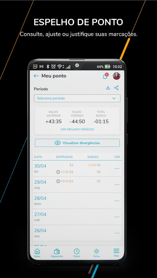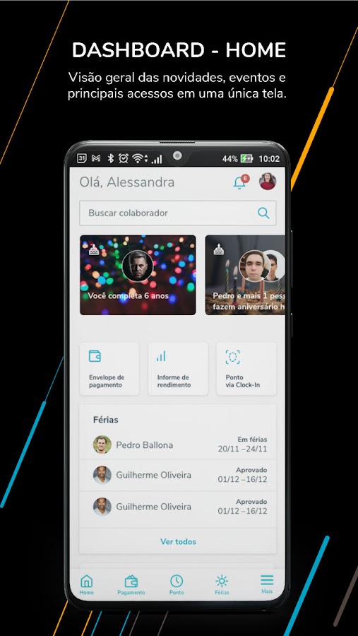 С помощью TOTVS Meu RH сотрудник сможет устанавливать свои часы с геолокацией, сотрудник сможет указывать свои входы и выходы из любого места. Кроме того, вы сможете легко получить доступ к конверту с платежами, запросить отпуск, просмотреть отчет о доходах и многое другое. Решение предлагает персонализированные информационные панели с вашими последними доступами, а также событиями, персонализированными вашей компанией, такими как дни рождения команды, предстоящие платежи и многое другое.
