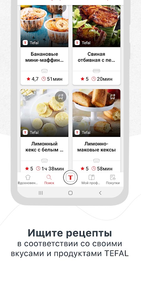 Приложение My Tefal – это ваш помощник на кухне, который сопровождает вас каждый день. Пошаговые рецепты помогут вам приготовить любимые блюда и десерты в соответствии с вашими предпочтениями, любимыми продуктами и количеством порций. Для каждого рецепта вы найдете подробное описание и время приготовления.