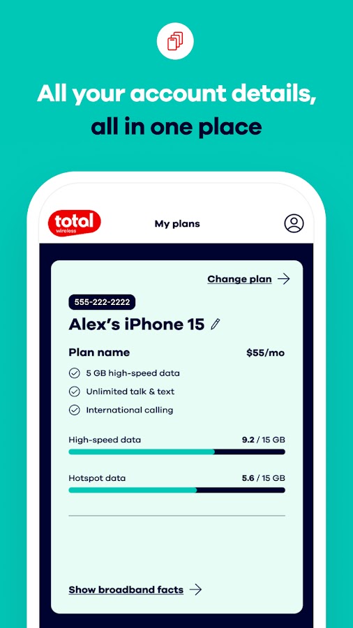 Приложение Total Wireless — лучший выбор для удобного отслеживания прошлых и будущих платежей, текущих тарифных планов и бонусов. Держите свою телефонную связь под рукой благодаря инструментам, разработанным для простого и удобного управления вашим тарифным планом. Получайте быстрый доступ ко всей информации об учетной записи и управляйте устройствами.