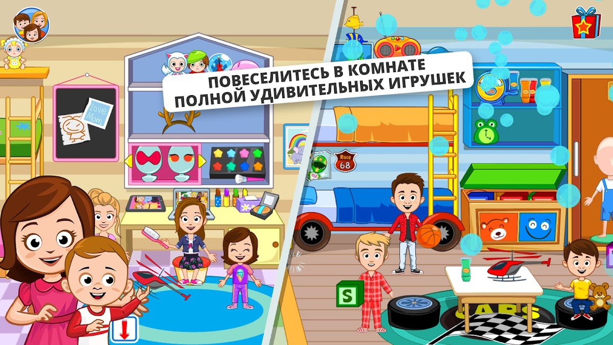 My Town: Семейный дом — это игровая вселенная, где ребёнок может свободно исследовать, фантазировать и придумывать свои сценарии. В отличие от обычных игр с жёсткими правилами, здесь нет заданий и ограничений: всё построено вокруг свободы действий. Ребёнок сам решает, что делать: приготовить завтрак, устроить вечеринку, примерить одежду или запустить радиоуправляемый вертолёт. Игра напоминает большой кукольный дом, где почти каждый предмет интерактивен — можно трогать, двигать, комбинировать и наблюдать за реакцией.