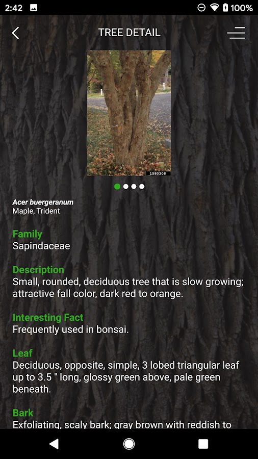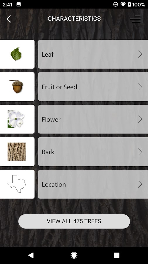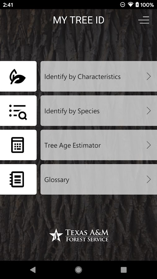 My Tree ID, разработанный Texas A&M Forest Service, облегчает идентификацию видов деревьев на основе листьев, цветов, семян, коры или местоположения с использованием ключа, описаний и изображений деревьев. Он содержит более 1500 изображений 475 различных видов деревьев и включает известные карты встречаемости почти всех видов из программы «Биота Северной Америки». На страницах с подробными сведениями о деревьях есть полные описания, включая интересные факты и похожие виды. Функция карты позволяет пользователям вводить адрес, выбирать текущее местоположение или щелкать любую точку на карте, чтобы сузить список. Полный глоссарий и инструмент для оценки возраста деревьев дополняют список ключевых и видов.