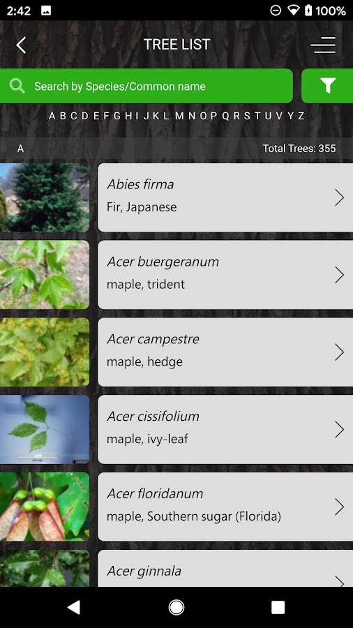 Есть два способа поиска видов. Один из них, метод, ориентированный на простой ключ по характеристикам, позволяет пользователям выбирать одну или несколько характеристик дерева из больших цветных значков. В любой момент процесса могут быть отображены возможные виды. Другой способ — выбрать определенные фильтры из списка видов от А до Я. Инструмент фильтрации также может сузить возможные варианты выбора на любом этапе процесса ввода. Список видов доступен для поиска по общепринятому или научному названию или просто по алфавиту.