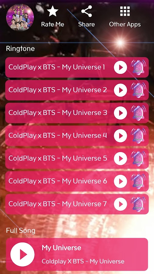 В любом случае, песня My Universe — BTS X Cold PLAY в разделе «Бесплатные рингтоны для фанатов» уже на вашем телефоне.