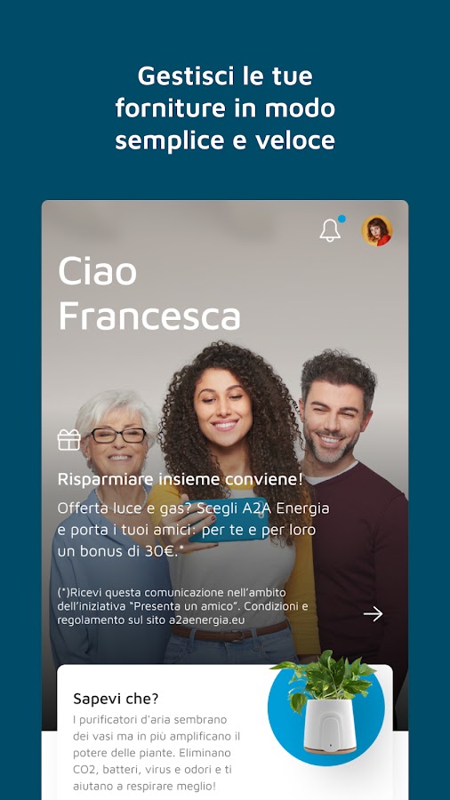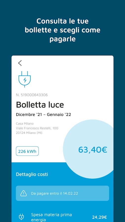 Управлять поставками электроэнергии и газа на свободном рынке стало еще проще с приложением MyA2A. Мы подумали о том, что действительно нужно нашим клиентам: быстрые платежи, обзор потребления, информация, поддержка. Все это теперь доступно!