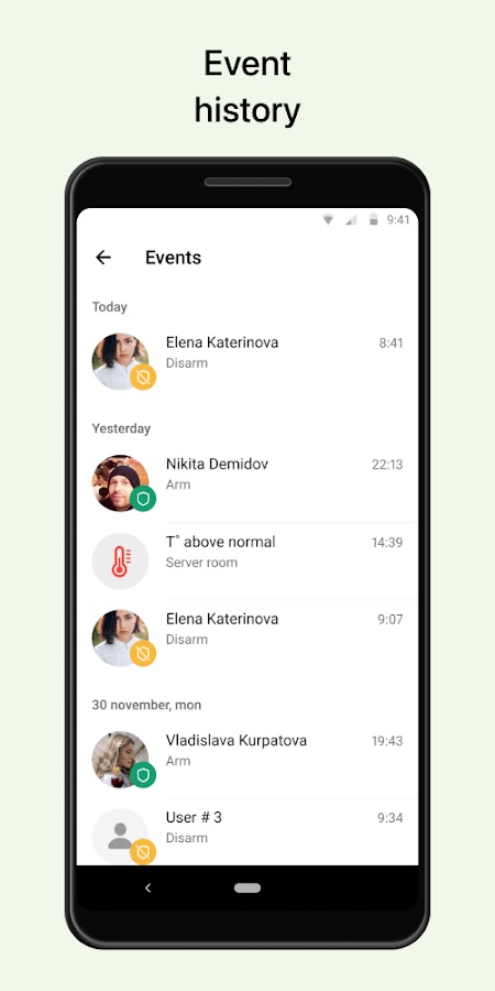 — лента событий покажет, что происходит на объекте: когда дети вернулись из школы, сотрудники взяли офис под охрану, отключилось электричество на даче