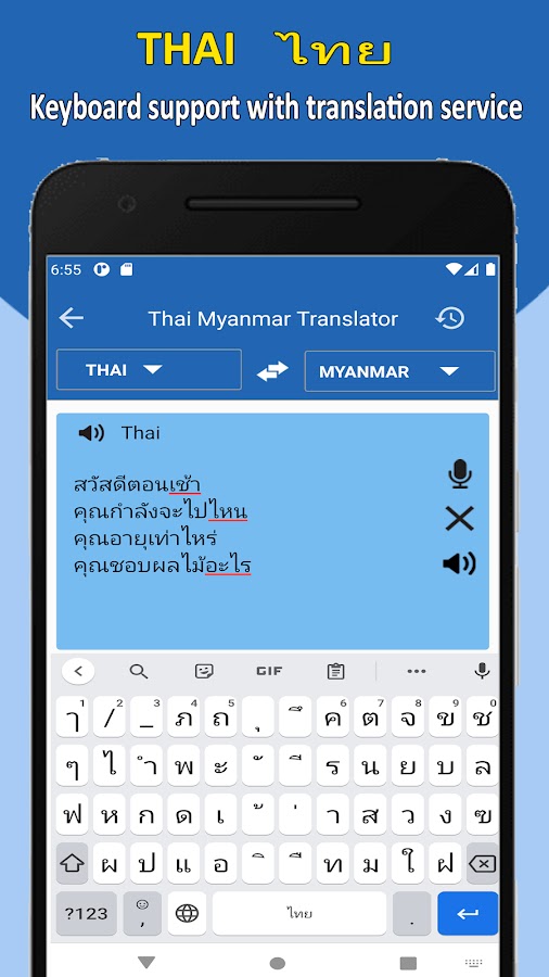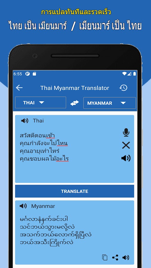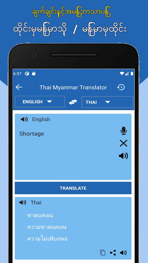 ထိုင်းမြန်မာဘာသာသည ်ဘာသာပြန်အက်ပ်တွင်အသုံးပြုသော အဆင့်မြင့်ဆုံးနည်းပညာဖြစ်သည်။ ထိုင်းမြန်မာဘာသာပြန်လျှောက်လွ ှာသည်စကားလုံးနှင့်စာသားအပြင်ထ ိုင်းမြန်မာဘာသာမှအသံများကိုဘာ သာပြန်ရန်သင့်အား ကူညီလိမ့်မည်။