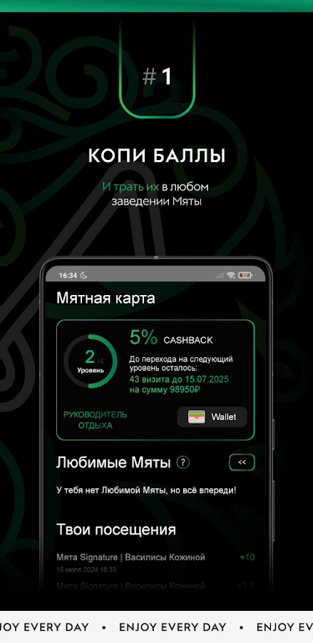 Система лояльности Мята позволяет копить бонусы при каждом посещении. Предъявляйте бонусную карту, копите или оплачивайте заказ до 20% от суммы чека.