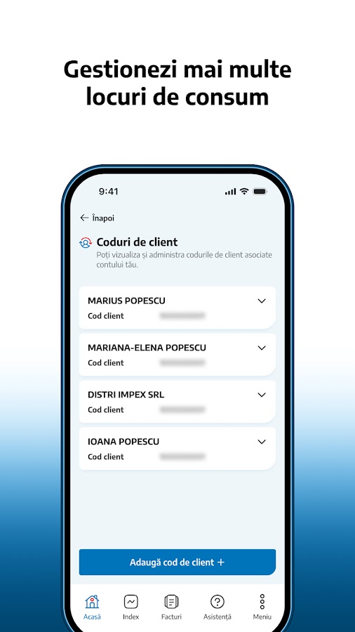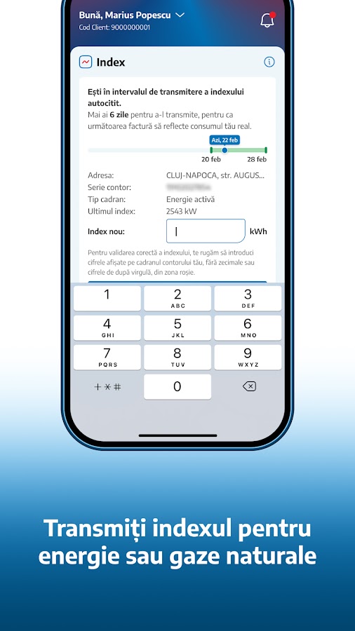 Для аутентификации вы будете использовать те же данные (адрес электронной почты + пароль), которые вы обычно используете для входа в веб-сайт MyElectrica (myelectrica.ro). Если у вас нет учетной записи MyElectrica, вы можете быстро и легко создать ее прямо из приложения, используя действительный адрес электронной почты, а также код клиента и номер точки потребления (NLC), которые вы можете найти в своем сервисном счете.