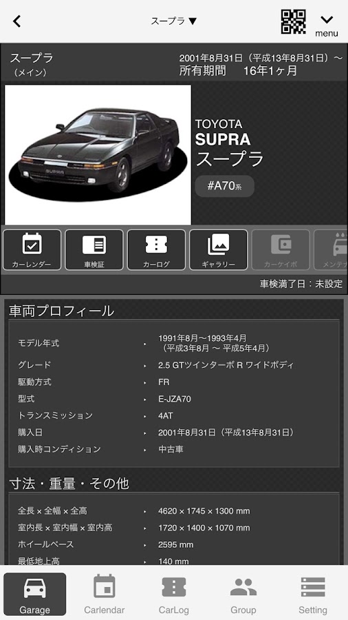 登録した車の車両情報、諸元情報、カスタマイズ情報等を管理できます。