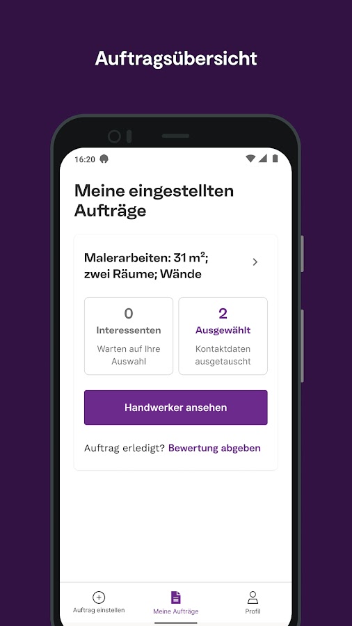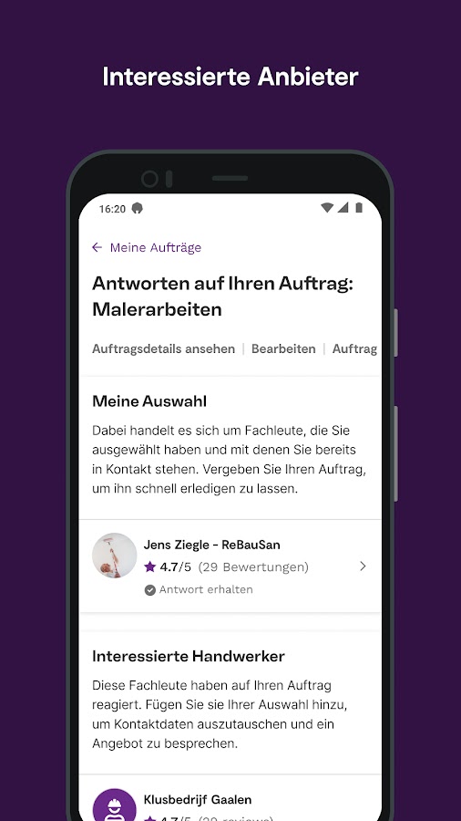 Собственные заказы и полученные предложения сравниваются в реальном времени с вашей учетной записью на my-hammer.de. Таким образом, у вас всегда есть вся важная информация и вы всегда в курсе событий!