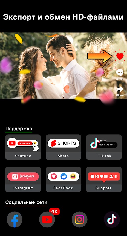 Экспортируйте в 4K, настраивайте разрешение, сжимайте без потери качества. Делитесь в YouTube, TikTok, Instagram и других соцсетях.
