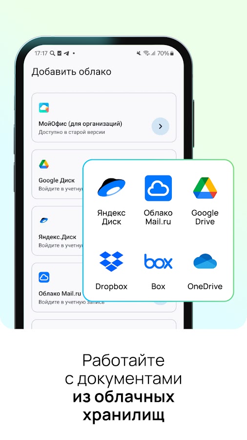 • Работайте с файлами на устройстве и в облачных хранилищах: Яндекс.Диск, Облако Mail.ru, Google Drive, DropBox, Box, OneDrive и «МойОфис Частное Облако».