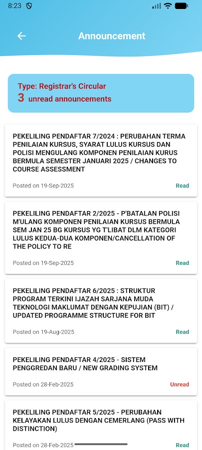 Вы будете уведомлены о последних объявлениях в Открытом университете Малайзии (OUM) МГНОВЕННО. Для студента это приложение предоставляет информацию о курсах, оценках, заданиях, расписании лекций/учебников и расписании экзаменов.