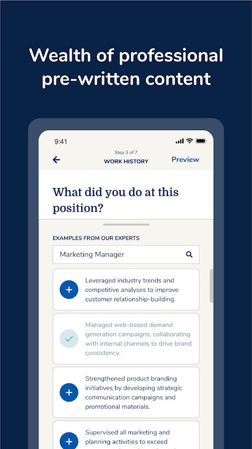 Получите поддержку в написании от опытных экспертов по карьере. Конструктор резюме My Perfect CV содержит тысячи одобренных рекрутерами фраз для сотен вакансий, готовых к мгновенному использованию.