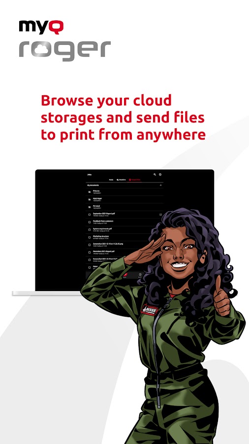 — Как распечатать? Нажмите «Распечатать все» для документов в очереди или выберите любой файл на своем мобильном телефоне. Облачная печать работает точно так же — просматривайте свои облачные папки прямо в приложении MyQ Roger Chromebook.