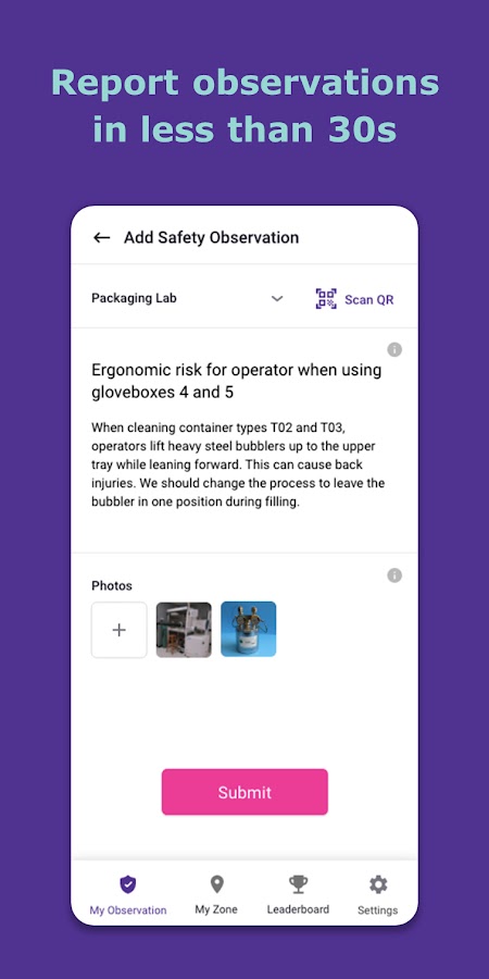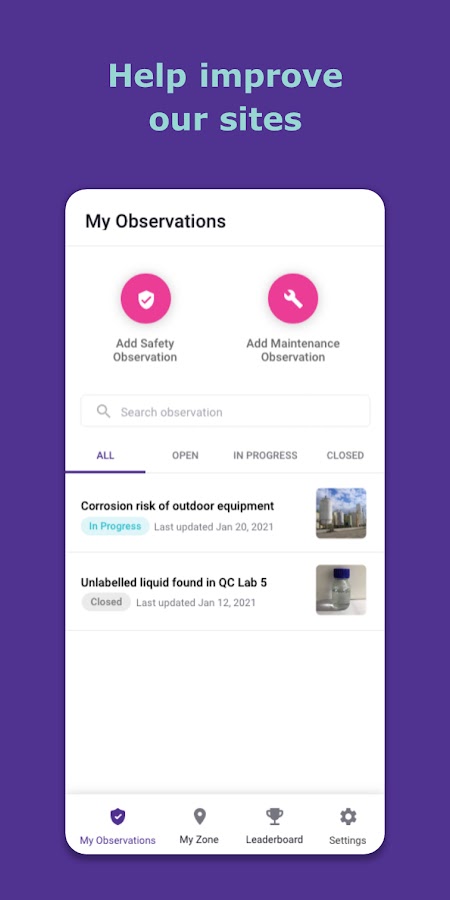 В рамках вашего посещения или повседневной работы на одном из наших сайтов MySite позволяет вам легко сообщать о наблюдениях за безопасностью и обслуживанием. Вы можете отправить фотографии любого опасного состояния, несоответствия, требуемого действия или идеи по улучшению за несколько секунд на своем смартфоне. Ответственный владелец зоны уведомляется, и вы можете отслеживать достигнутый прогресс.