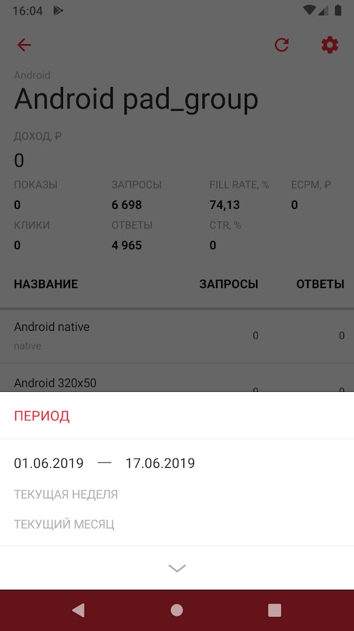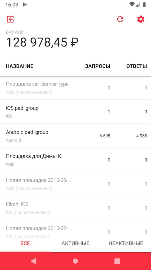 Вы можете просматривать основные метрики в разрезе площадок (ваши приложения или сайты) и рекламных блоков (формат размещения на площадке).
