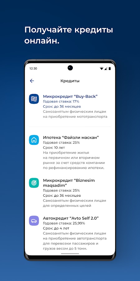 А также, с помощью мобильной платформы My Turon, клиент имеет возможность отправить заявку на получение кредита на покупку автомобиля (автокредит — первичный рынок), микрозайм на сумму свыше 30 млн. сум, потребительский кредит, кредит на медобслуживание и на туризм.