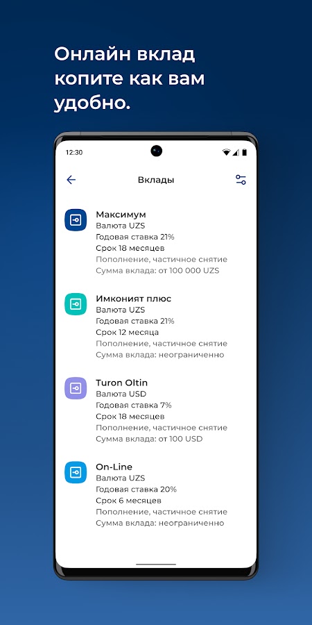 Одно из основных преимуществ нового мобильного приложения – это возможность не выходя из дома, заказать любую карту АКБ “Туронбанк”, с получением карты в любом удобном филиале, а также доставкой до двери курьерской службой Банка.