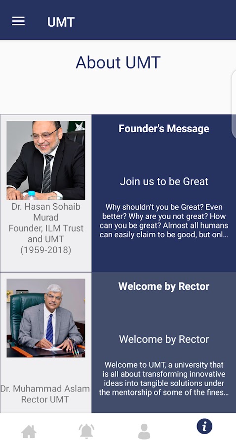 Мы рады приветствовать Вас в мобильном приложении Университета управления и технологий. UMT является одним из ведущих частных исследовательских университетов Пакистана. Программы, предлагаемые в UMT, одобрены Комиссией высшего образования, а также Пакистанским инженерным советом. UMT превратился в ведущее высшее учебное заведение в стране.