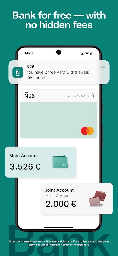 – Достигайте своих целей, организуя свои средства на субсчетах N26 Spaces, и автоматизируйте свои сбережения с помощью N26 Round-ups.