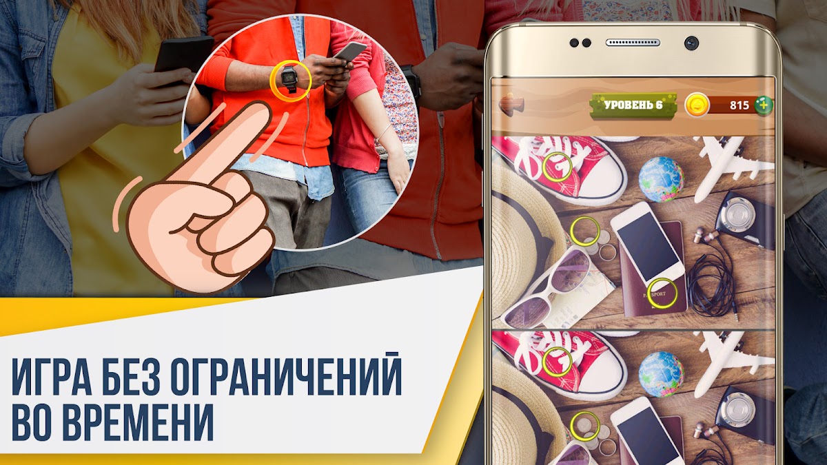 Увидев различия на двух картинках нужно тапнуть по ним, найти точки (пятна), где картинки отличаются. Обнаружив все отличия вы перейдете на новый, еще более захватывающий уровень.