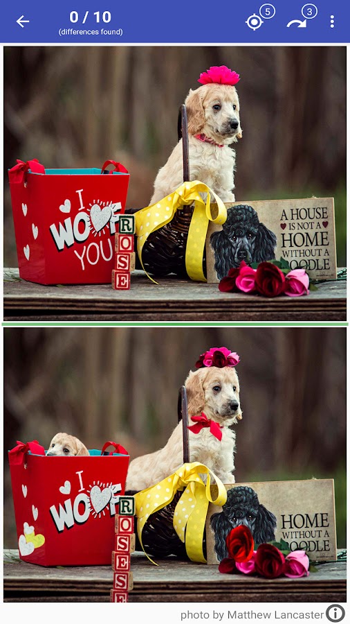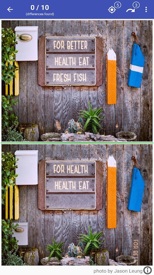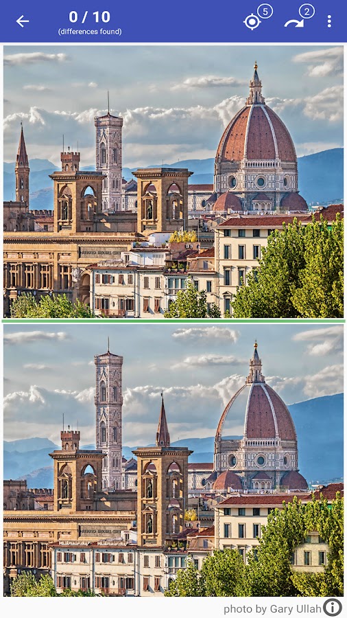 В игре более 4000 уровней с качественно сделанными отличиями — все отличия довольно заметны и не должны вызывать при поиске излишнего напряжения. Но если какое-то отличие ускользает от Вашего взгляда, то функция масштабирования поможет обнаружить даже хорошо спрятанные различия. Но если и увеличение по какой-то причине не помогло Вам найти отличие, то воспользуйтесь подсказкой. Так же уровень можно отложить и доиграть потом. Подсказки и пропуски уровней восстанавливаются — подождите некоторое время, и они будут восстановлены.