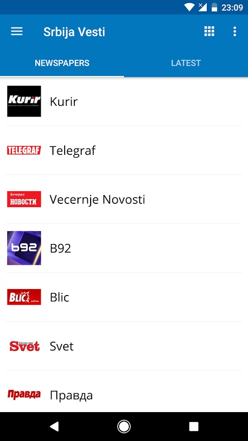 Вот доступные газеты: Kurir, Vecernje Novosti, Blic, Informer, ALO!, Telegraf, Правда, Danas, N1, Sportske, ПОЛИТИКА, СПОРТСКИ ЖУРНАЛ, PTC, B92, Svet Scandal, Mozzart Sport, Nezavisne Novine, Vesti Online, СРБИН.ИНФО — Srbin.info, Mondo, Tanjug, Južne vesti, Vreme, 021, NS Uživo, Studio B, Naslovi, Peščanik, Vesti.rs, Njuz, Dnevnik, Beta, Izavov, Istinomer, Serbiancafe, Time.rs, Hrvatska Riječ, Глас Подриња — Недељне новине, BBC, Aktuelno.net, ČA Glas, CNET News, Hlas ľudu, Magyar Szó