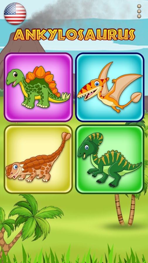 Забавная игра-динозавр для детей, где они узнают свои имена и тренируют свой разум с помощью различных игр.