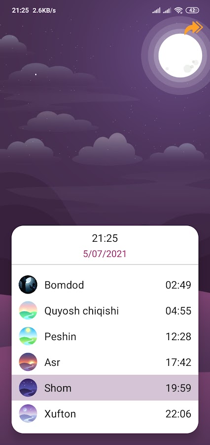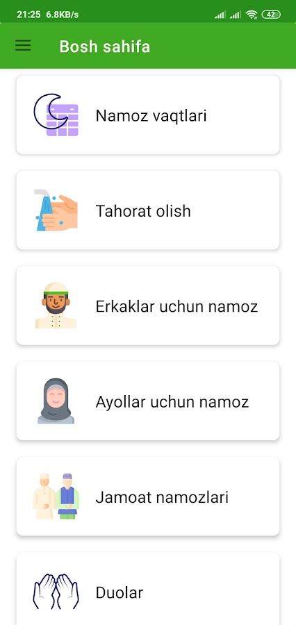 Намоз vaqtlari bo’limidan sizning turgan joyinggizga nisbatan siz uchun anniq vaqtlarni ko’rsatib beradi. Бундан ташкари дастурда яна намоз о’кишни видеоларга караб о’рганиш бо’лими хам мавджуд бо’либ, у оркали намоз о’кишни тез ва то’г’ри о’рганиб олишинггиз мумкин.