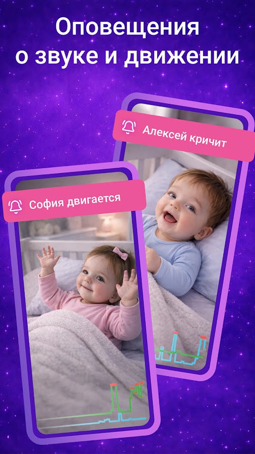 Nani распознаёт звук и движение и сразу отправляет уведомление − чтобы вы могли быстро отреагировать, даже если телефон не в руках.