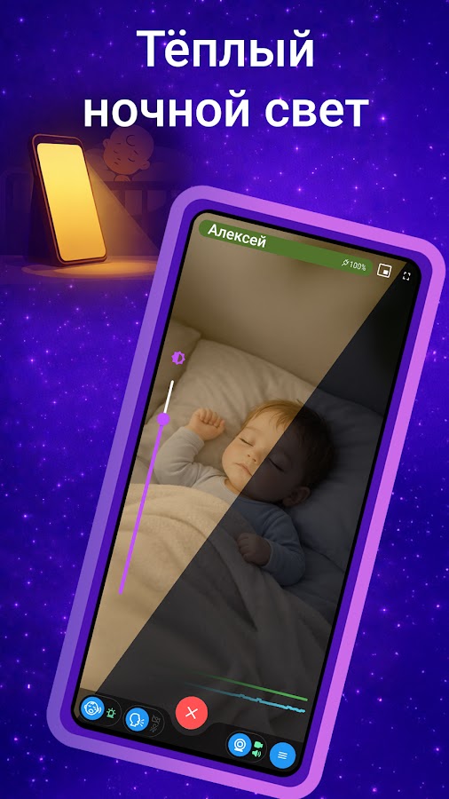 Смотрите и слушайте малыша дома по Wi-Fi или в дороге через мобильную сеть (4G/5G/LTE).
