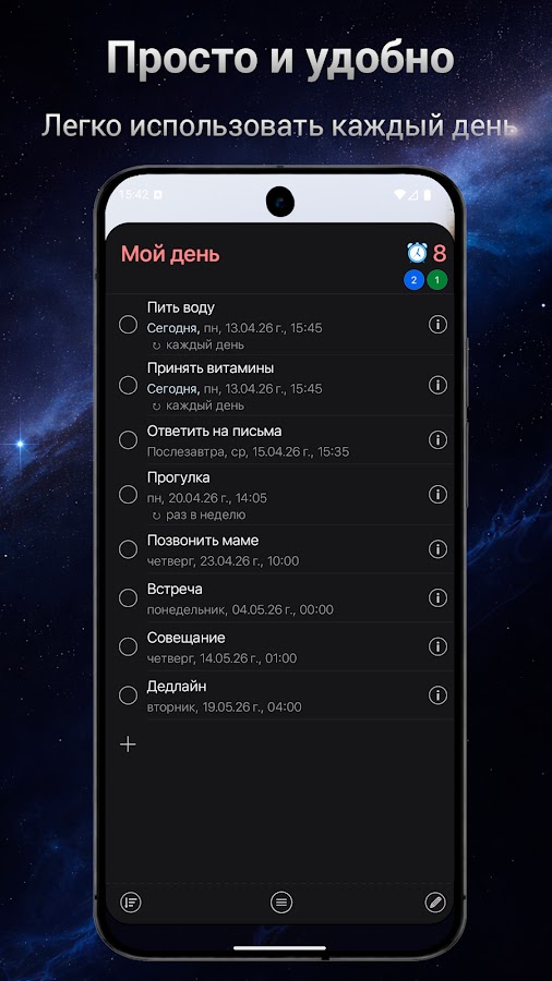 * Повторяющиеся напоминания для ежедневных и еженедельных задач