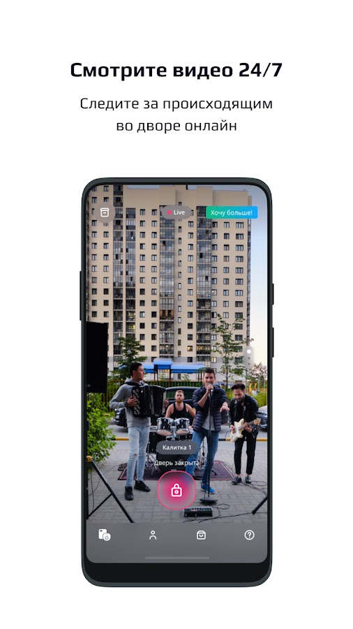 Камеры видеонаблюдения — незаменимые помощники в вопросе безопасности дома. Смотрите в режиме реального времени дворовые, подъездные камеры, а также камеры, установленные в лифте или на этаже. Легко переключайтесь между камерами на главном экране.