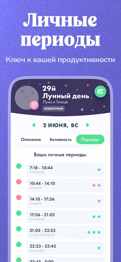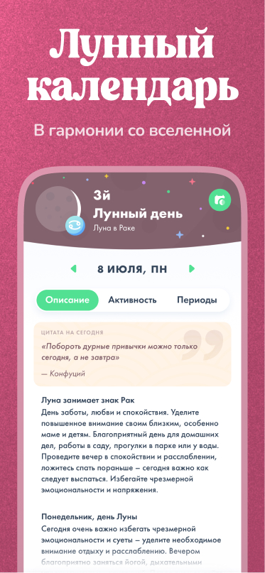 Используйте фазы Луны, чтобы планировать свои дела. Лунный календарь подскажет, какие дни принесут больше энергии, которую вы сможете использовать для достижения своих целей в разных сферах жизни — отношениях, бизнесе, здоровье, и многих других. Имеется возможность расчета ваших ежедневных астрологических периодов. В приложении также имеется календарь Экадаши с уведомлениями — вы можете изучить описание и историю каждого Экадаши.