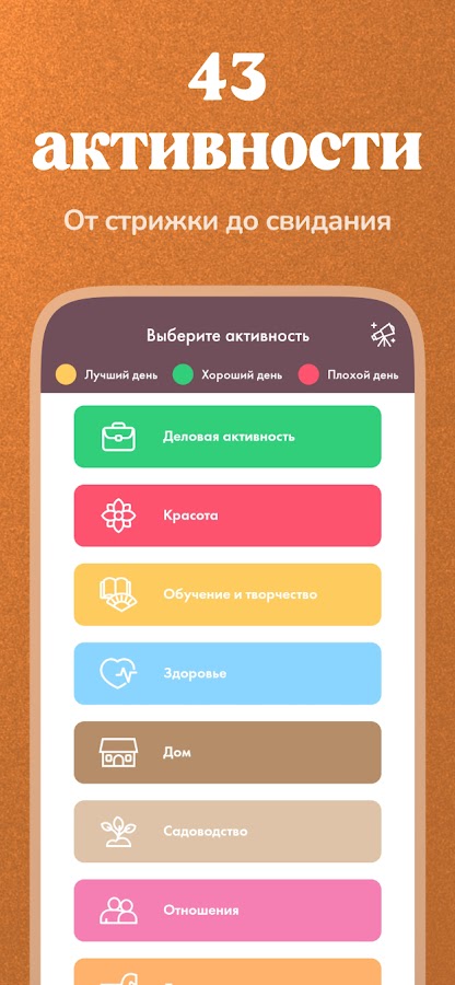 Используйте наш Планировщик, чтобы узнавать личные мухурты — благоприятные астрологические периоды для реализации своих планов и намерений. Мухурта доступна для десятков различных активностей: деловые встречи, свидания, календарь садовода, календарь стрижек и покраски, маникюр, свадьба, зачатие ребенка, путешествия и многое другое.